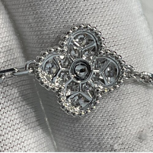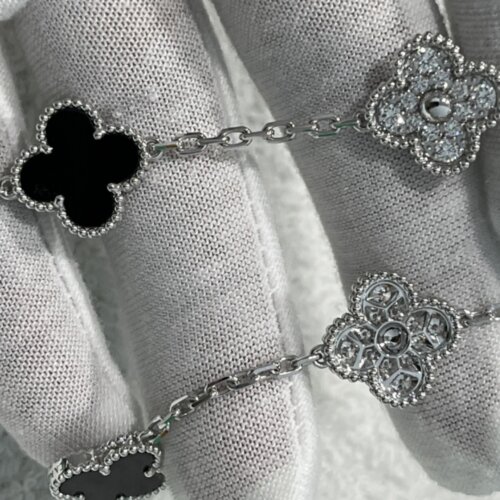Embrace the elegance of Van Cleef & Arpels with this exquisite 18K gold bracelet, adorned with a captivating black onyx centerpiece. The design features five charming flower motifs, each meticulously crafted to showcase the timeless allure of this luxury brand. The bracelet’s sophisticated charm style is perfect for adding a touch of glamour to any ensemble, making it an ideal accessory for both day-to-evening wear.The lush black hue of the onyx stone beautifully contrasts with the warm glow of the gold, creating a piece that’s both striking and versatile. Whether it’s a treat for yourself or a special gift, this authentic Van Cleef & Arpels bracelet is sure to become a cherished addition to any jewelry collection.